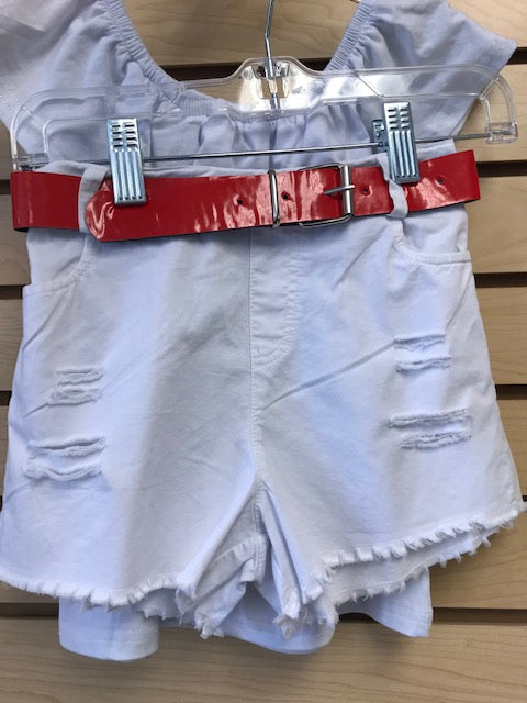 white shirt with red stitched rose and white jean shorts w/ red belt
