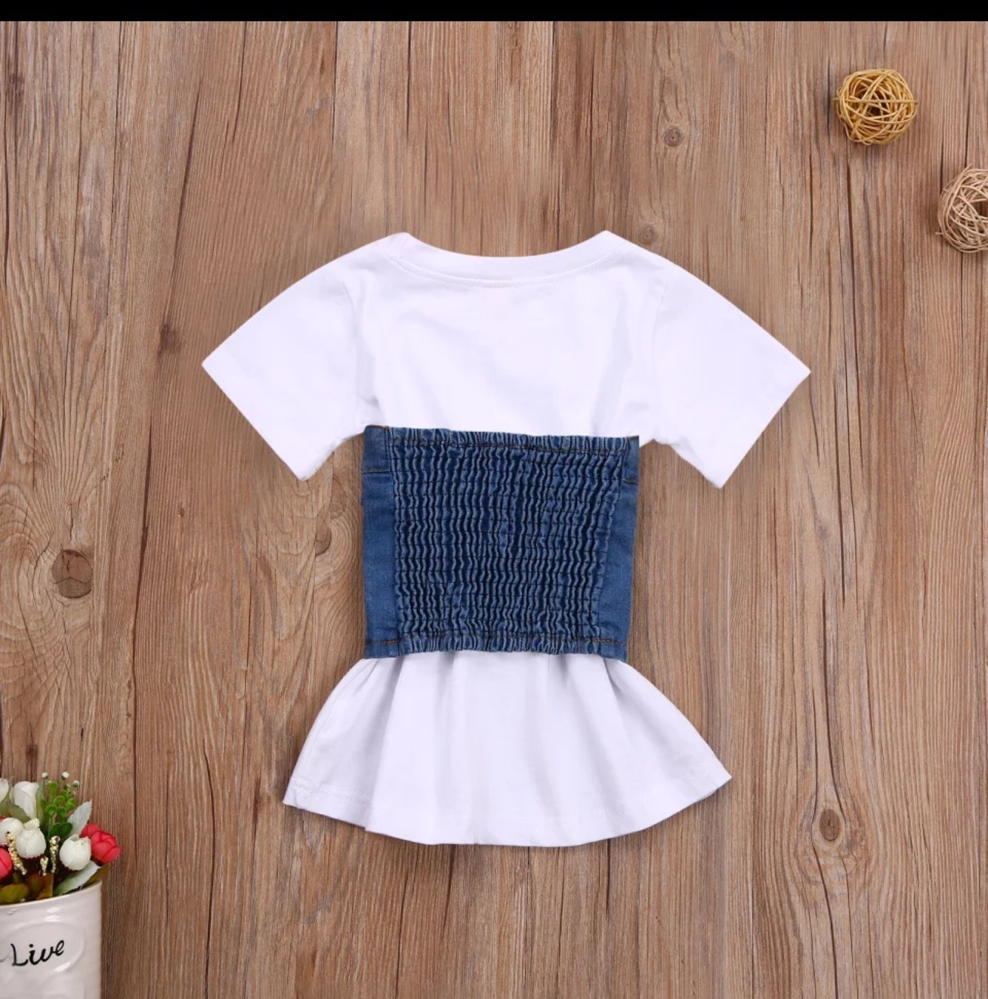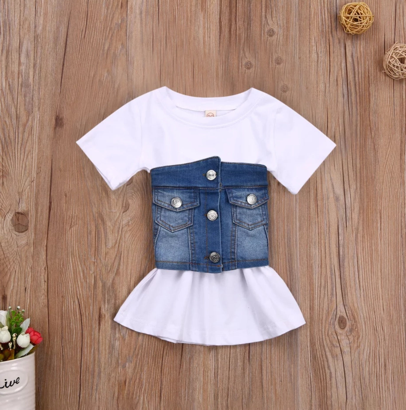 A-Line cotton shirt dress with O neck, denim vest with elastic back. (hat not included)