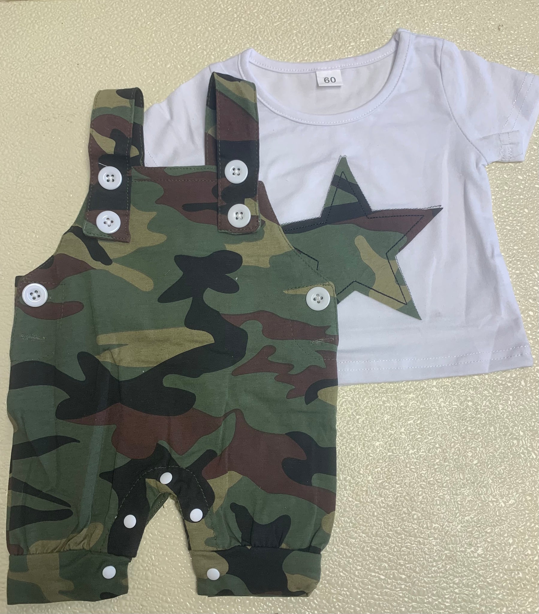 Unisex overall set with green army print overalls and white shirt with an army print star.